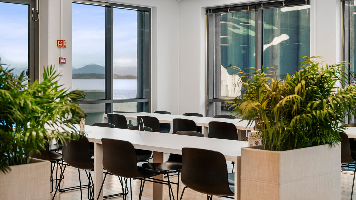 Et arkitektonisk imponerende bygg. Interiøret er designet med fokus på både funksjonalitet og estetikk, noe som gir et profesjonelt og innbydende miljø for både ansatte og besøkende. Lyse og romslige kontorarealer gir god fleksibilitet, mens store vindusflater gir rikelig med naturlig lys og en fantastisk utsikt over fjorden.